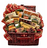 Snow is falling, a fire is crackling and family and friends will soon be gathering around this elegant gourmet gift hamper that offers a true taste of the holiday season along with some deliciously decadent treats. Send this basket full of gourmet treats including truffle cookies, kettle corn, stuffed olive, salmon pate and more. This attractive hamper includes: Smoked Alaskan salmon fillets, Vintage cheddar cheese, pimento stuffed olives, three pepper crackers, old fashioned kettle corn, smoked almonds, classic creamy vanilla caramels, double chocolate truffles, smoked lobster pate, parmesan crackers, cheddar cheese straws, chocolate cream wafer cookies, chocolate cream puff cookies, and holiday coffee. Delivered in a holiday hamper and topped with a beautiful holiday bow.