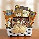 A gala of golden Ghirardelli chocolate glitters in this dramatic holiday gift box of chocolate treats. A black and white woven container creates a big holiday impact and is filled with bags of Ghirardelli chocolate squares, Ghirardelli Masterpiece chocolates, creamy hot chocolate and a Ghirardelli chocolate bar. Too delicious to miss and makes a wonderful holiday gift!