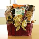 This fun-filled basket is stuffed with treats for serious snackers. They'll devour chocolate chip cookies, Crunchie Munchies nut snack mix, Sonoma cheese straws, butter-toffee pretzels, chocolate covered espresso beans, truffle cookies, California almonds, chocolate-covered graham crackers, and a yummy fudge brownie.