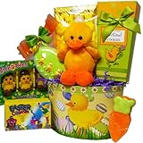 Lucky Ducky is ready to share his best Easter wishes this year! He's nestled in a colorful paperboard gift tub surrounded with yummy Easter sweets and treats. Enjoy Marshmallow Peeps, Double Crisp Chocolate Chick-a-dee, Too Good Gourmet Duckie Shortbread Cookies, Chocolate Chip Easter Cookies, a hand frosted Carrot Shaped Cookie and Easter Egg Cookie decorated with little baby duckies. Each gift is hand crafted with attention to detail, tied with a pretty bow and includes a personalized gift message from you to convey your best wishes.