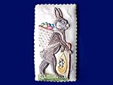 The Lemon Springerle Easter Bunny Cookie from Embossed Edibles shows an Easter bunny walking with a basket of colored eggs over his shoulder and the sack he is carrying is full of colored eggs. The cookie measures 7 in. x 3 1/2 in., comes in a nest of green, yellow or pink edible Easter grass and is packaged in a platinum gift tin with satin ribbon and an embossed seal. When you place your order, this cookie is created using a Springerle mold and then baked and hand-decorated. Springerle cookies have a unique rich lemon cake-like texture inside with a crispy outside. Springerle molds and recipes used for baking cookies come from a very old European tradition. These cookies can be eaten, or left to air dry and be used as ornaments.